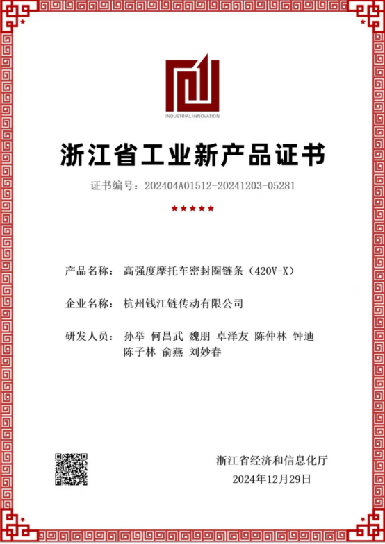 La catena con guarnizione a olio per motociclette ad alta resistenza modello 420V-O(X) sviluppata e prodotta da Hangzhou Qianjiang Chain Industries Co., Ltd. supera la certificazione di nuovo prodotto a livello provinciale