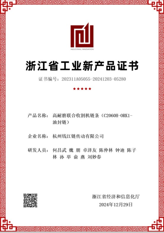 Per risolvere questi problemi, l'azienda ha sviluppato la "catena per mietitrebbie combinate ad alta resistenza all'usura C2060H-ORK1 con guarnizione a olio". Ottimizzando il design della struttura della catena, utilizzando acciaio strutturale legato di alta qualità, adottando la tecnologia di stampaggio di precisione della matrice composita CNC e il processo di tempra isotermica con trattamento termico, la resistenza e la durezza superficiale dei componenti della catena vengono migliorate, le prestazioni di tenuta dell'olio lubrificante per le parti ingranate vengono migliorate, la resistenza alla corrosione aumenta e la durata utile viene estesa.